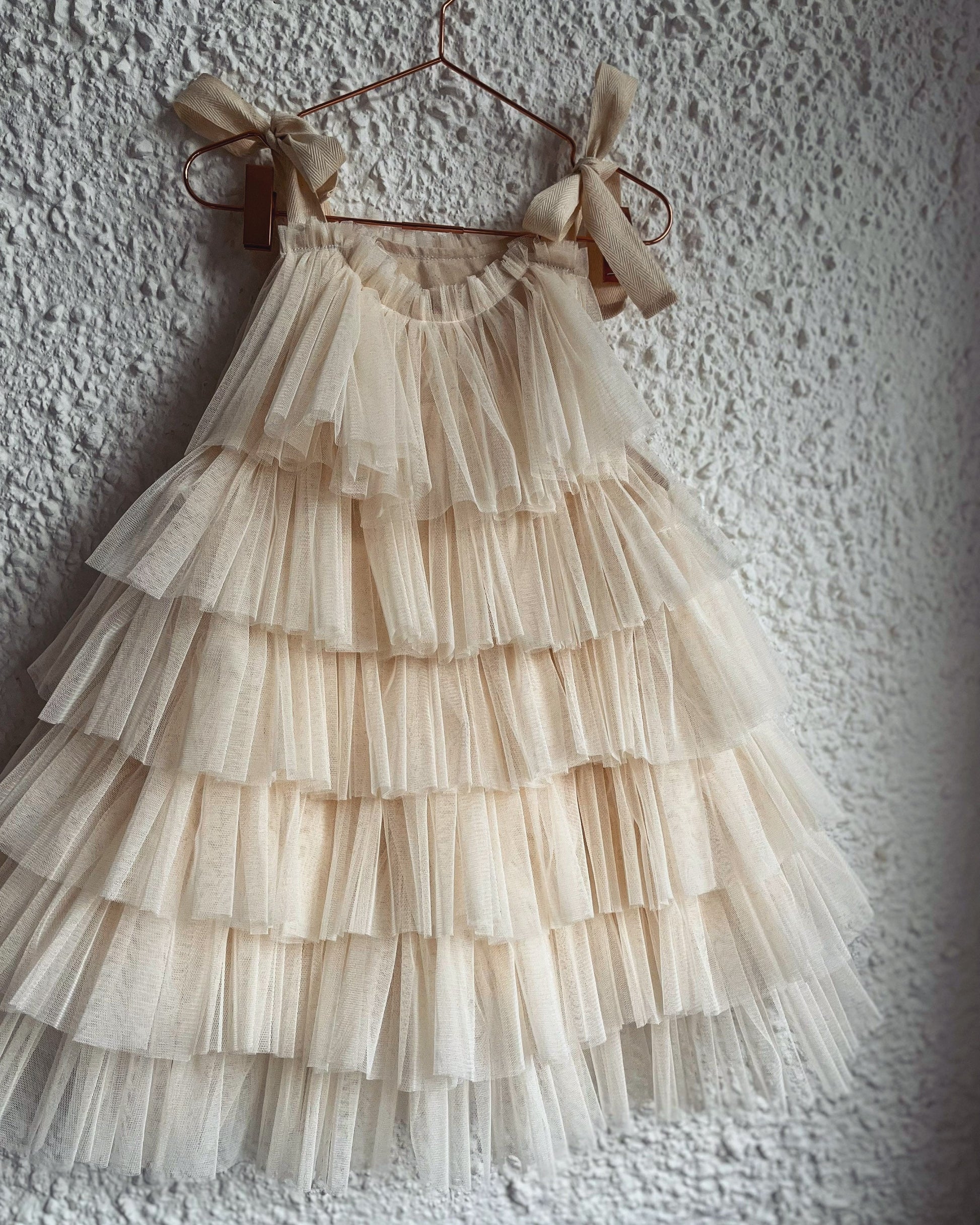 Cream ruffle dress Made from the softest tulle. fully lined with cream cotton fabric and finished with cream cotton herringbone tape ties shoulder tie fastening The most perfect dress for parties!! Dress it up with pretty shoes or dress it down with dm’s and a leather jacket. Pretty or edgy, you decide! Comes in 3 different sizes.. Age 1-4 50cm in length Age 5-8 65cm in length Age 9-11 80cm in length The dress is quite wide so you can get a good few years out of it. different lengths, smaller/bigger sizes,Mama size on request. I can also make in different colours, just message me. Handmade in the uk hand wash only keep away from fire