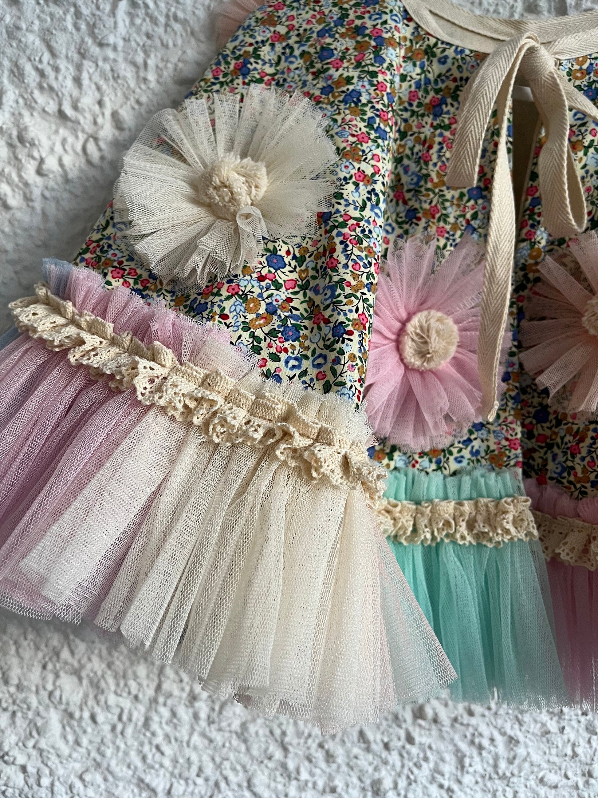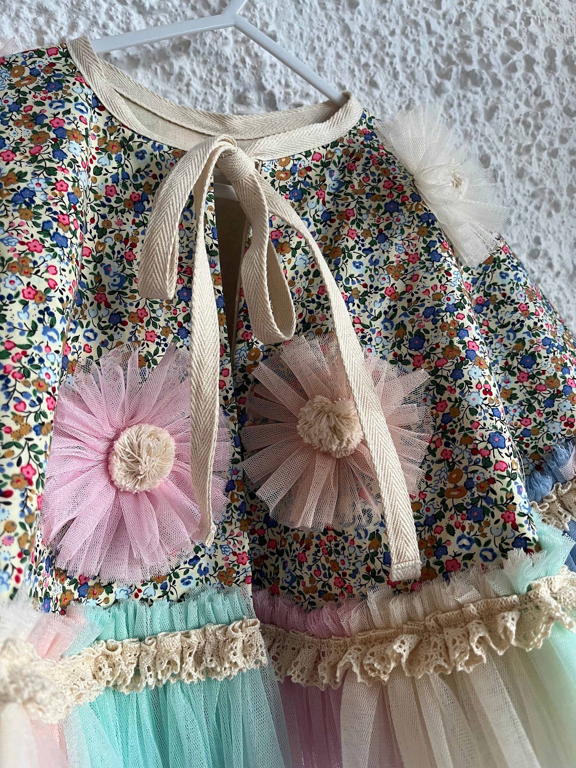 made from lovely soft 100% cotton, embellished with ruffle flowers and finished with pastel ruffles/lace trim
