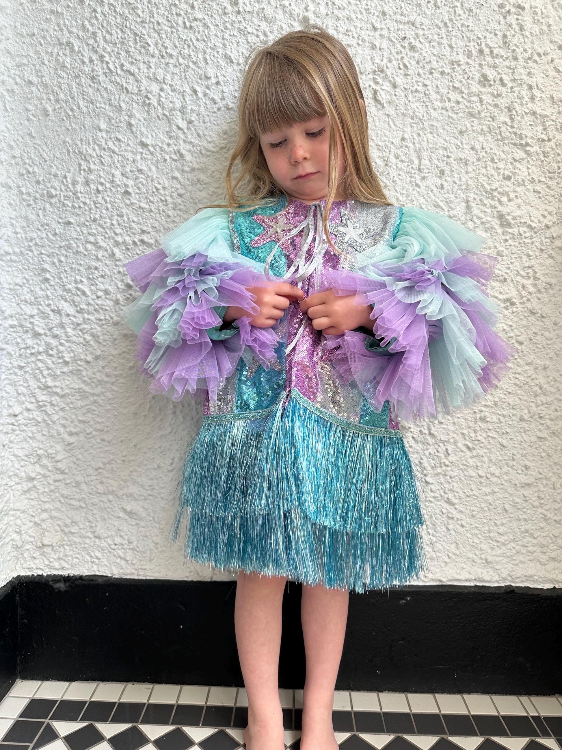 Stunning Little Mermaid inspired jacket. Made from panelled sequin strips, ruffles and finished with a glitter vinyl.