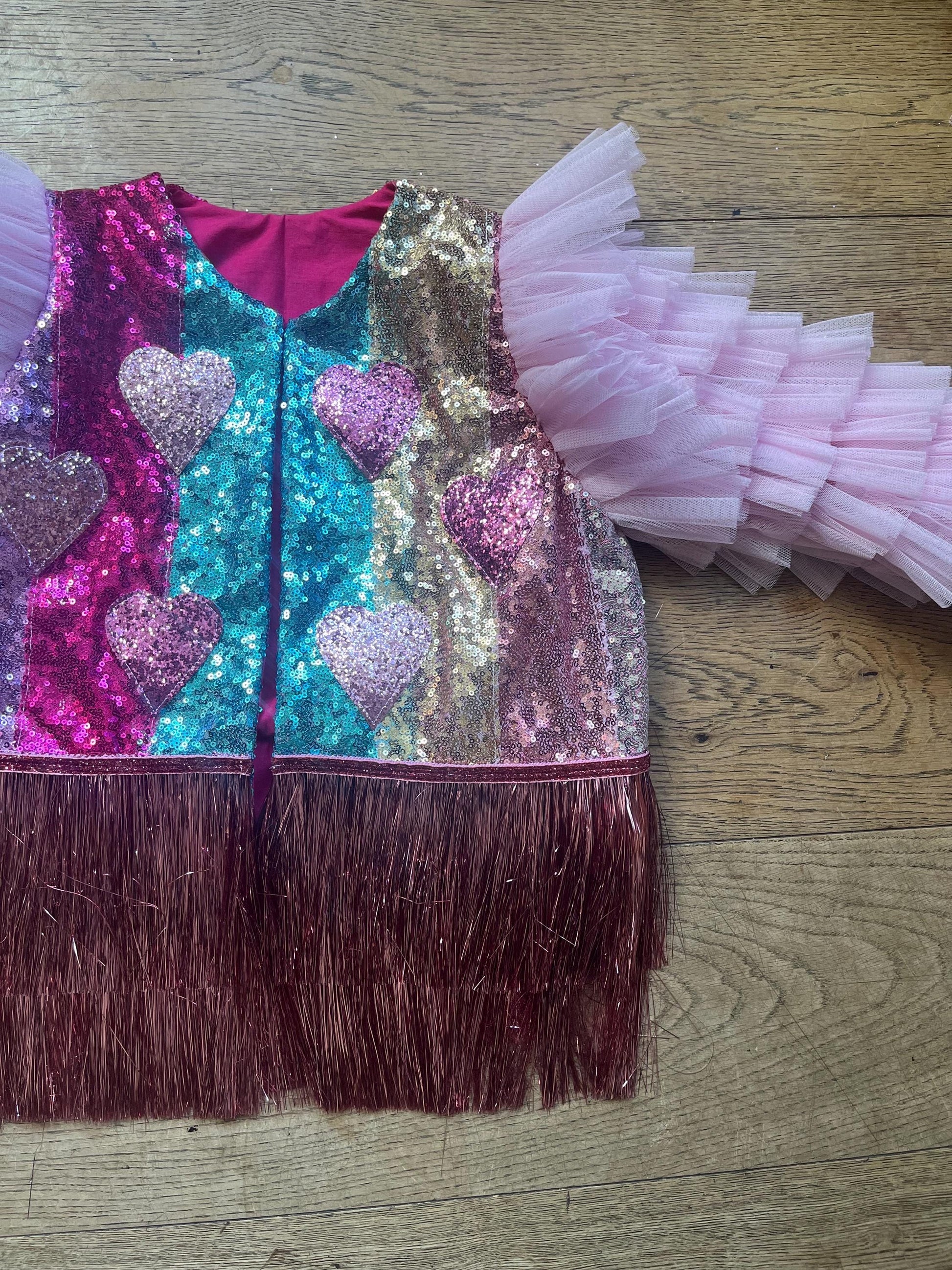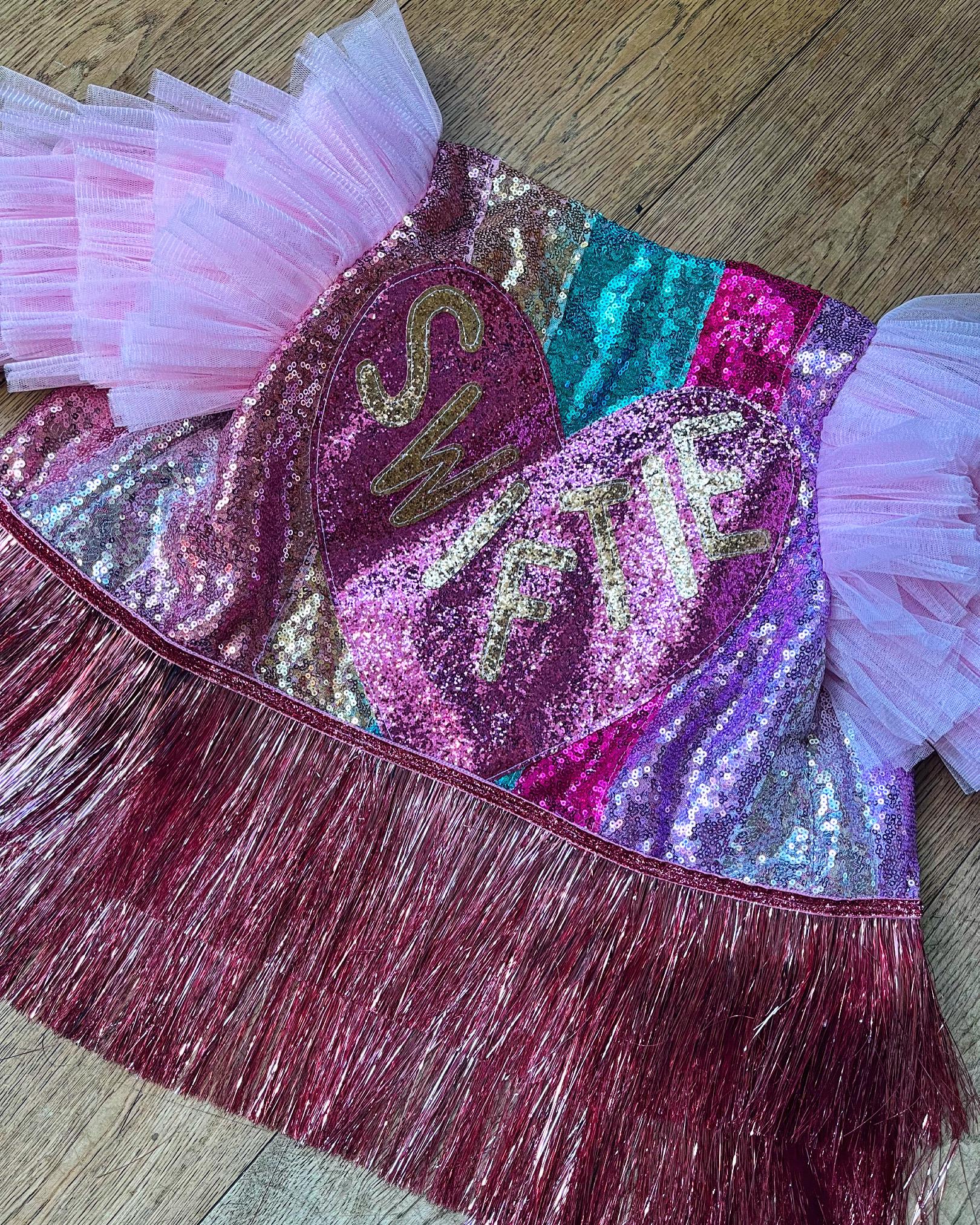 Stunning Taylor Swift inspired lover jacket. Made from panelled sequin strips, ruffles and finished with a glitter vinyl swiftie heart (on back) glitter vinyl hearts (on front) and good quality pink tinsel fringing. Fully lined with pink 100% cotton fabric satin tie ribbon on front if you wish to tie it.