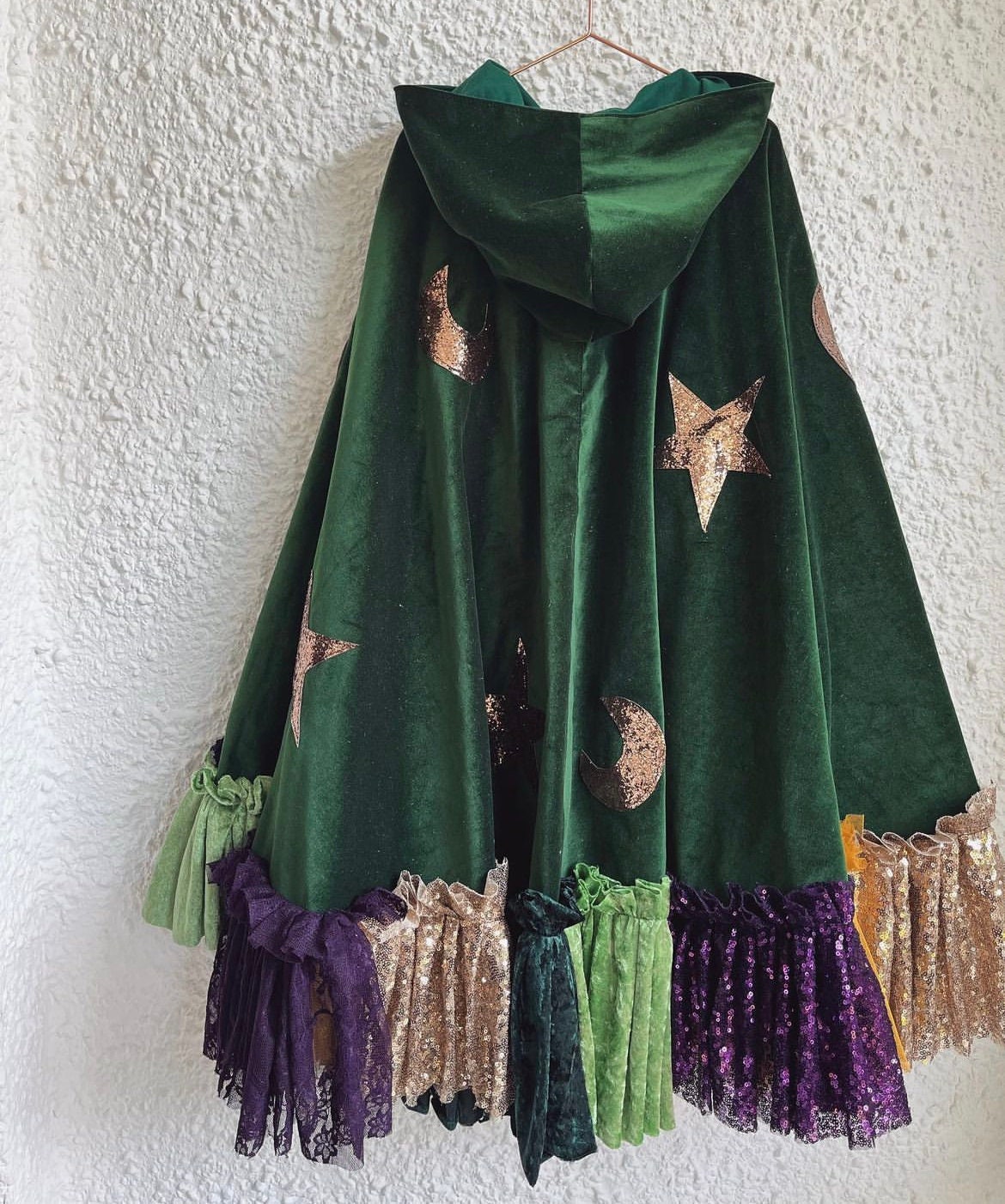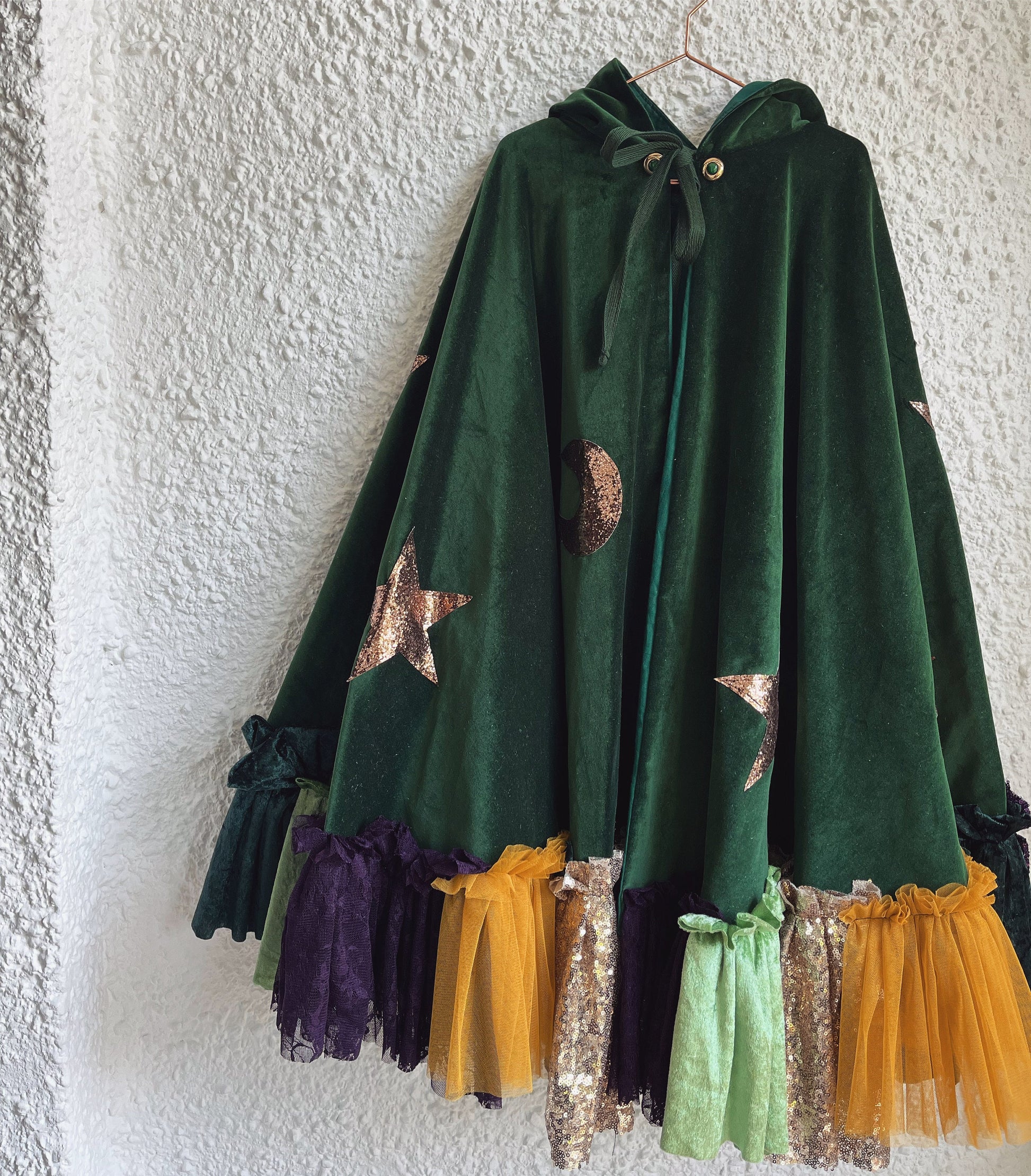 Mixed fabric ruffles, gold glitter star/moon embellishments all over cape to finish