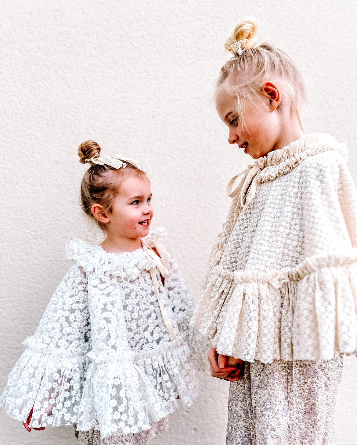 Embroidered daisy sheer cape with frill Made from a lovely soft tulle, lined and finished with a cream cotton herringbone tie. Choose from 2 sizes. Mini size 1-4 years Kid size 5-8 years Handmade in the uk Keep away from fire Always supervise child whilst wearing